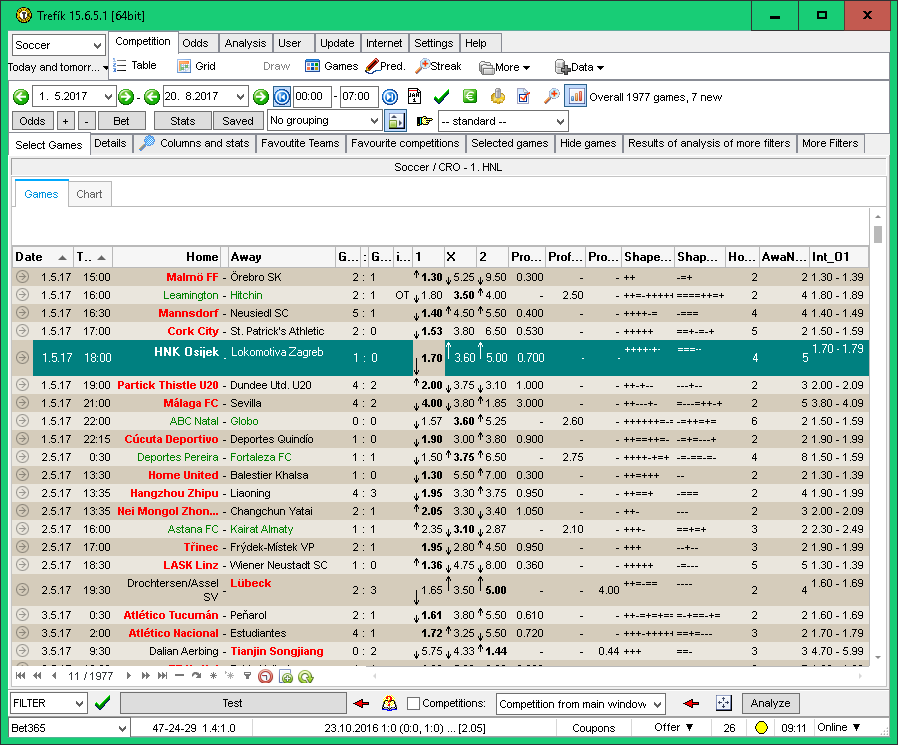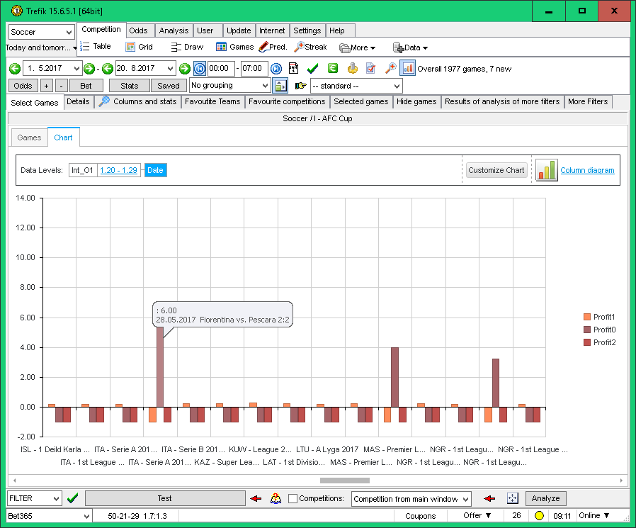 When using the created filter for the football matches for the dates 1.5.2017 - 20.8.2017 and bet365 odds we would get the following list of matches: