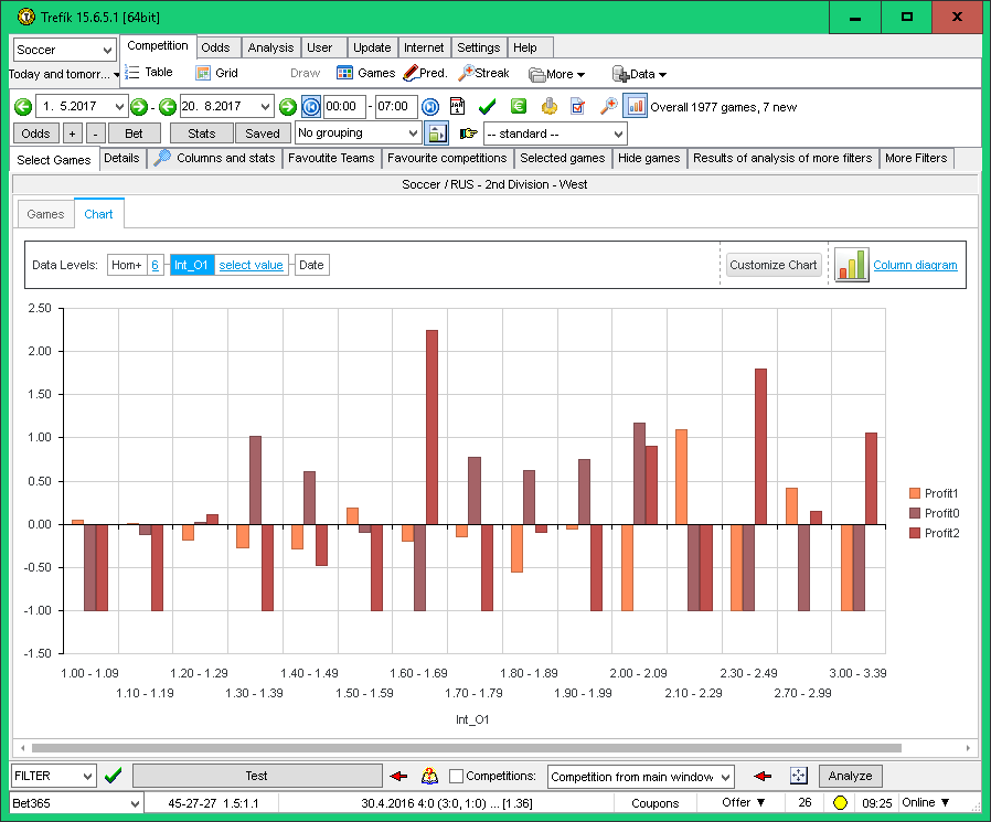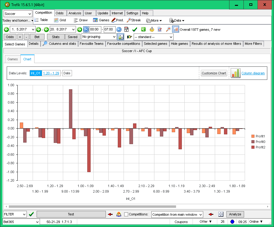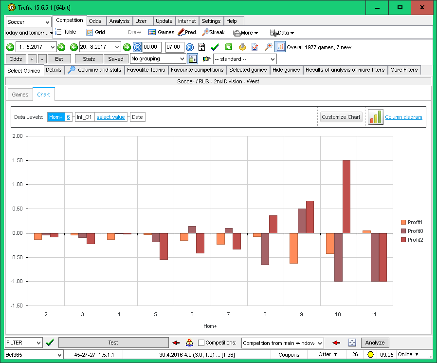 .. the chart options can be changed by the button CUSTOMIZE CHART. We can select the column which should be visible. The picture shows the column with profit for 1 / X / 2 (these columns must be activated at the Filter / Columns area). We can see that the Profit1 is positive only for the odds intervals with the limit 2.50 - 2.69.