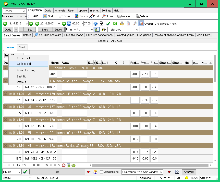 .. the odds intervals are ordered from those with the highest Profit1 value. Ordering by a summary value can be set also directly at the list of matches: using the right mouse button at a group heading - there is a menu and you can select the order summary option.