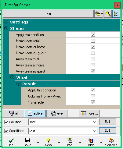 To illustrate this feature we can create an easy filter. It will contain just the active section Filter / Shape and it will return the column with the home team results at home and the away team results as guests: