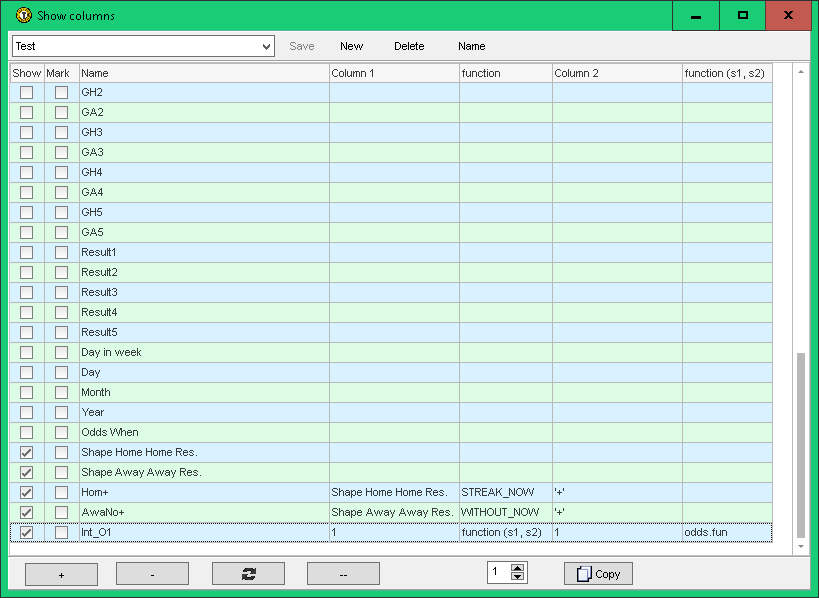.. the columns "Shape Home Home Res." and "Shape Away Away Res." are activated: there will be returned the characters + / = / - according to the recent team results.