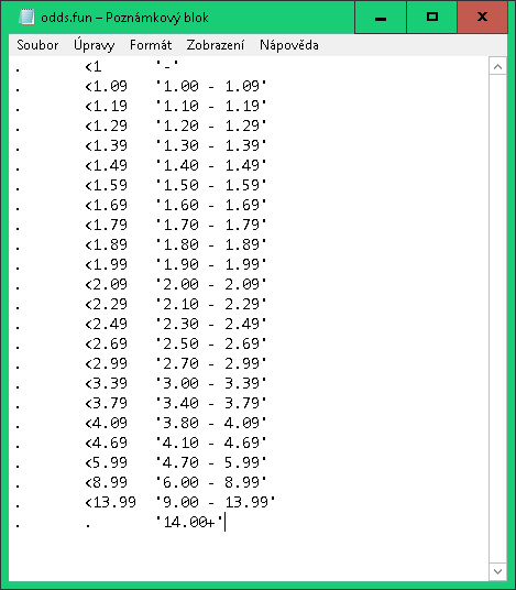 .. the file contains three columns divided by TAB. The first column contain just the dot which means this column is ignored this time. The second column contains the comparing formula and the third column contains the returned value. We have the third column values at the single paragraphs which defines the outpit text value. When using the defined FUN file it is started at the first row and finished at the row where the comparing is met. Our file is created to return the information about the odds intervals.