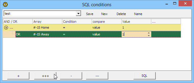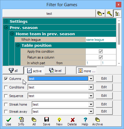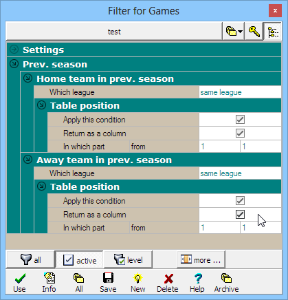 The following short sample illustrates how to filter the matches using combined conditions at the Filter / Conditions section. We will filter according to the ranking at the previous season of the same league. The task is to display the matches with the winners of the previous season.