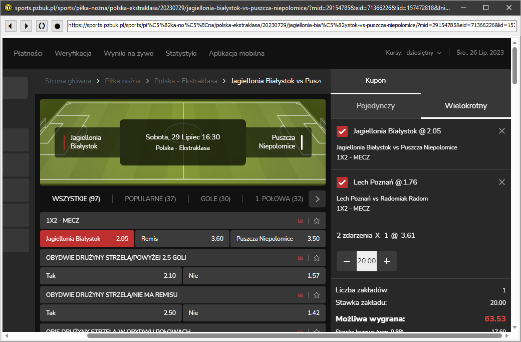 Z Trefíka jednym kliknięciem na mecz można przejść do serwisu PZBuk z kompletną ofertą kursów na dany mecz.